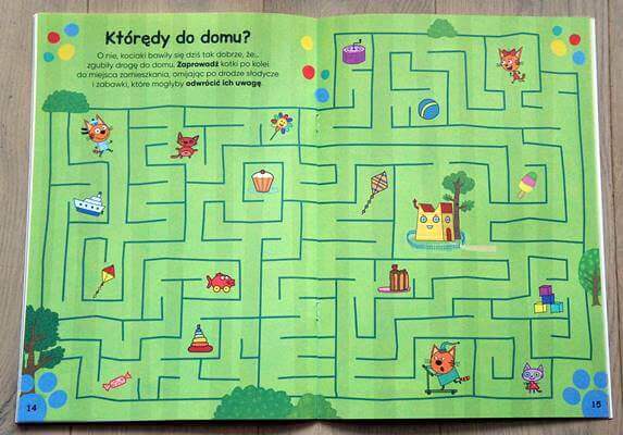 Zeszyt zadań wciągnie nasze dziecko w fantastyczny świat zagadek, łamigłówek i labiryntów. Moja córka spędziła przy tym dość dużo czasu. Pewne zadania wymagały mojej pomocy, ale z innymi radziła sobie doskonale sama. Myślę, że każdy znajdzie tu coś dla siebie, ponieważ wybór zadań jest na prawdę duży. Oczywiście i tutaj znajdziecie zestaw kolorowych naklejek.